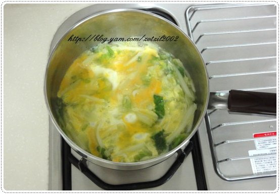 5、打開鍋蓋,加點鹽,淋上蛋汁。