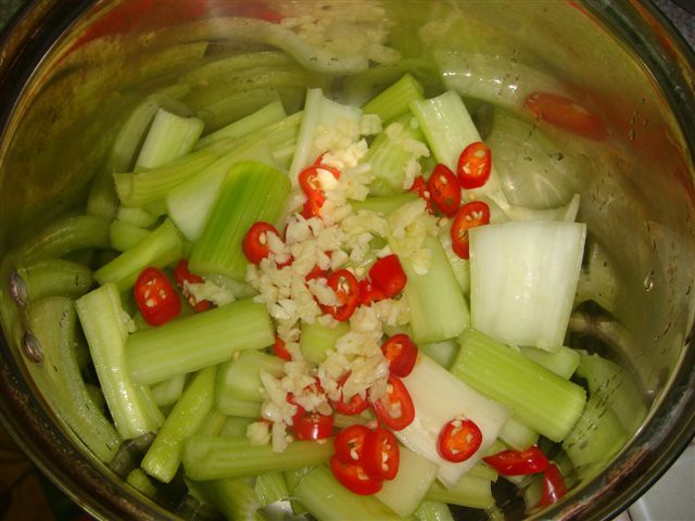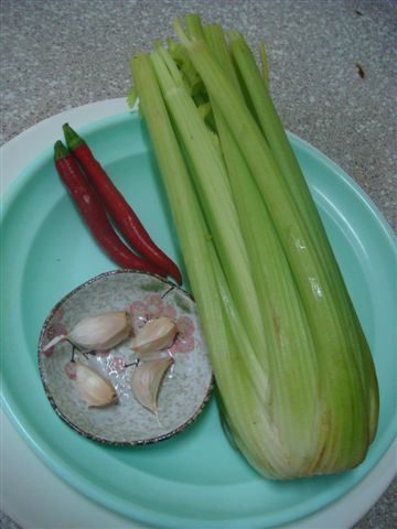 西洋芹一把, 蒜頭4瓣, 紅辣椒2條