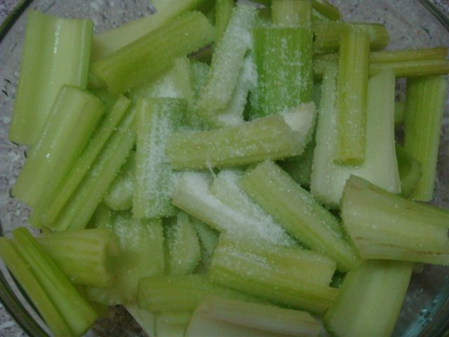 芹菜去皮後再將每根芹菜切成4cm段狀, 用鹽醃10-15分鐘讓芹菜出水,