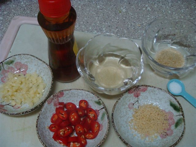 鹽 1/4小匙, 糖 1/2小匙, 白醋 2大匙, 鮮炒手半匙. 香油少許