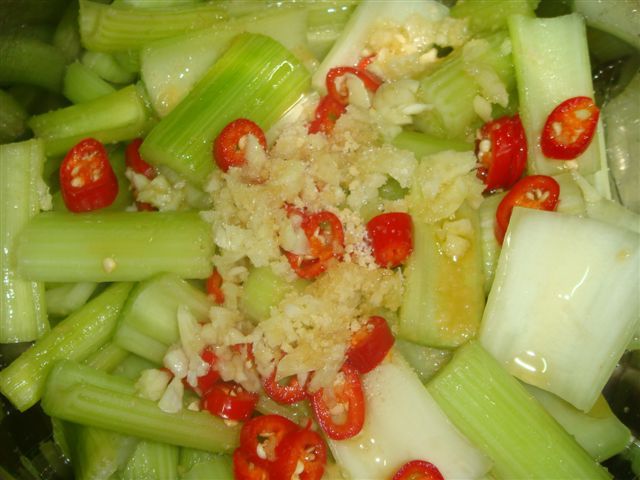 將出水後瀝乾後的芹菜加上切片的辣椒及切末後的蒜瓣