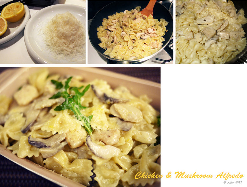 4.用橄欖油,一點蒜頭(可以不用)炒香鷄肉和蘑菇,再把剩下的的半杯奶油,帕馬森起士和之前煮的‘2’和‘3’全部放進去,用小火慢慢拌直到汁變稠,調味即可。(帕馬森起士本身有鹹味,所以要注意鹽的分量;如果太稠,也可以加一點煮麺的水調整)