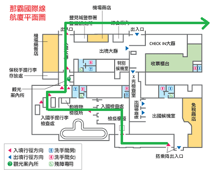 接駁巴士會把旅客放在下面那霸國際線航廈平面圖入口的位置,