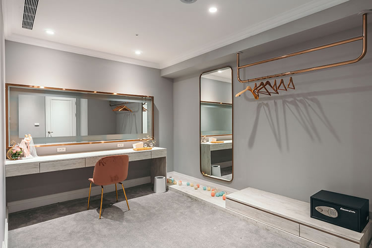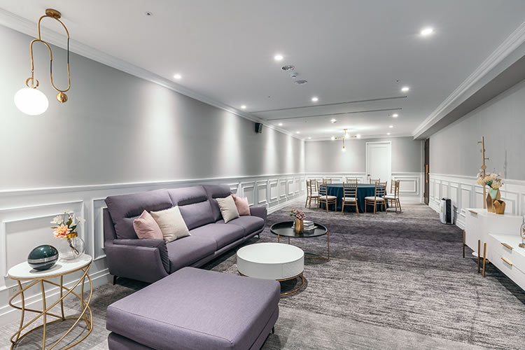 新娘房就接在宴會廳旁,空間十分寬敞,備有基本的長沙發與茶几,能容納多位親友在裡頭稍作休息或一起聊天,梳化與休息的空間設計是分開的,絕對是新娘夢寐以求的休息室設計!