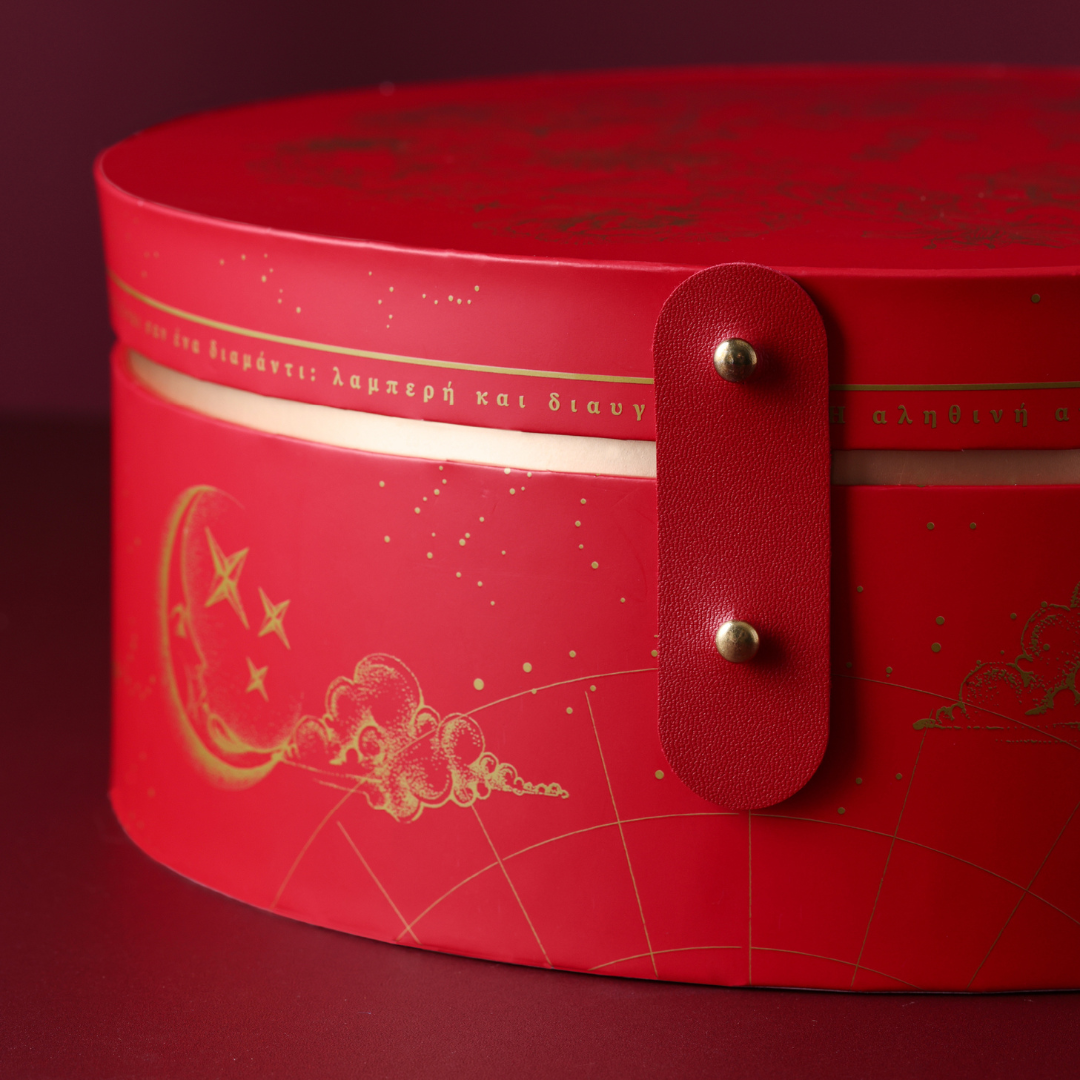 這款禮盒一推出就攻佔新人社團討論區,短時間內累積許多 KOL 與婚禮網站的真實開箱!與最近在社群瘋傳的『台灣感性』有異曲同工之妙,將這種復古紅盒的元素搭配閃耀的燙金、皮革金扣,以圓型禮盒的形式呈現,象徵「圓滿長久」的祝福。