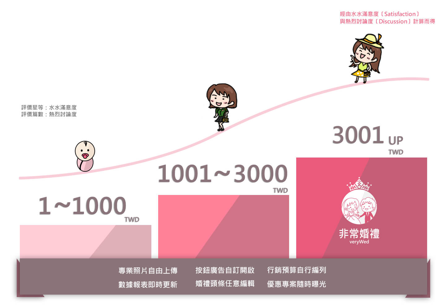 veryWed為台灣婚禮評價網站之領導品牌,首創婚禮資訊透明化,從而培養出許多高黏著度的水水用戶。veryWed每月進站流量達500萬,擁有超過 90萬位忠實會員, 集結全台灣704間婚禮廠商,也累積多達3萬5千則真實消費評價,正因為我們掌握龐大的婚訊資料量,才能成為水水們籌備婚禮時必造訪的婚禮資 訊平台。